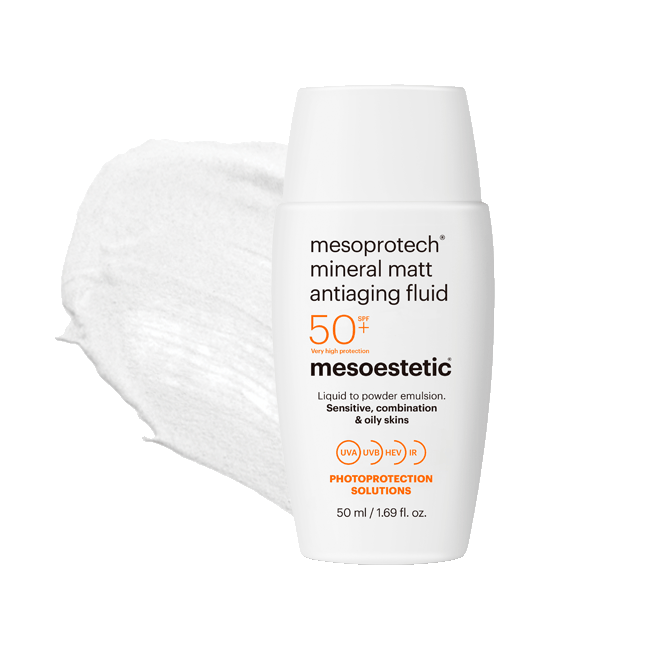 Fluide anti-âge SPF 50+ à haute tolérance pour les peaux mixtes, grasses et sensibles, élimine l´excès de brillance et laisse un fini mat sur la peau, sans brillance.